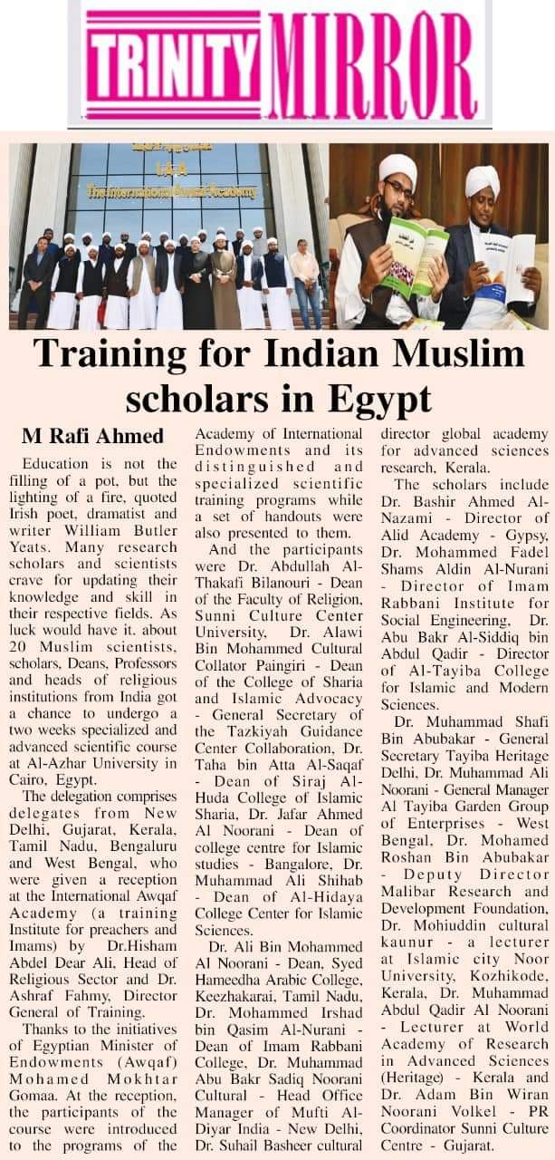 أشادت الصحف الهندية بتدريب العلماء المسلمين الهنود في مصر، ومن ذلك ما ذكرته صحيفة " Trinity mirror" الهندية.