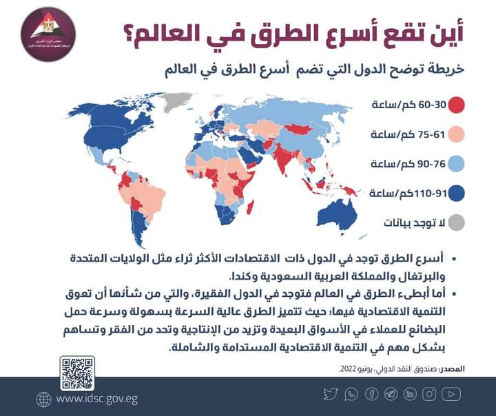 نشر مركز المعلومات ودعم اتخاذ القرار بمجلس الوزراء إنفوجرافًا جديدًا عبر صفحته الرسمية على موقع التواصل الاجتماعي تحت عنوان "أسرع الطرق في العالم توجد في هذه الدول".