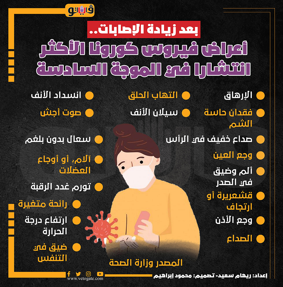 بعد زيادة الإصابات.. أعراض فيروس كورونا الأكثر انتشارا في الموجة السادسة| إنفوجراف السبت 16/يوليو/2022 - 04:27 م 7/16/2022 4:27:44 PM فيروس كورونا ريهام سعيد شارك طباعة 18 حجم الخط شارك طباعة ارتفاع درجة الحرارة اعراض فيروس كورونا فيروس كورونا الصحة كورونا