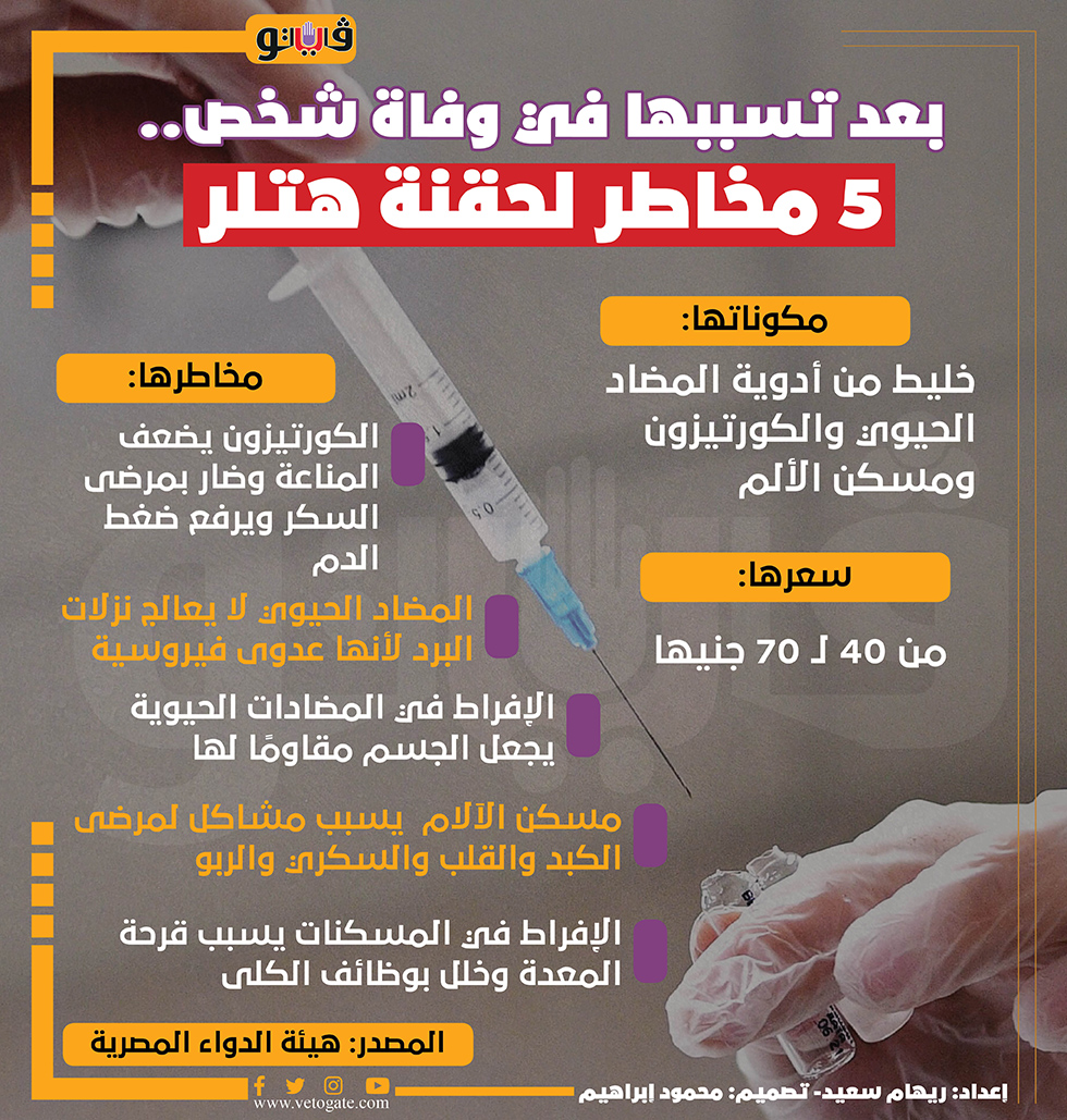 بعد تسببها في وفاة شخص.. 5 مخاطر لحقنة هتلر | إنفوجراف السبت 16/يوليو/2022 - 09:15 م 7/16/2022 9:15:38 PM حقنة هتلر ريهام سعيد شارك طباعة 18 حجم الخط شارك طباعة الدواء المصري ارتفاع ضغط الدم مرضي السكر السكر المضادات الحيوية وارتفاع ضغط الدم هيئة الدواء المصرية
