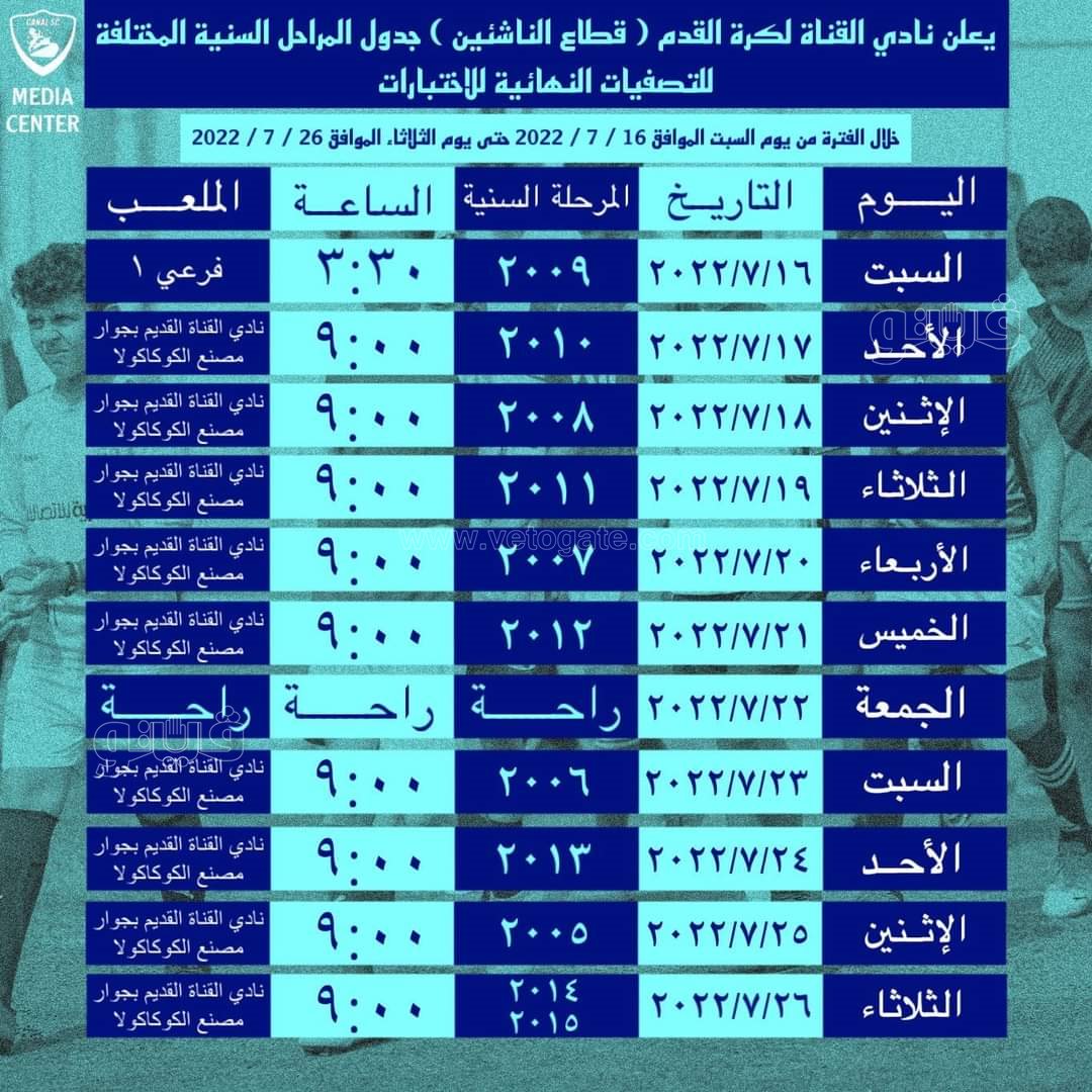 اختبارات الناشئين 2022.. أعلن نادي القناة تعديلات جديدة على مواعيد التصفيات النهائية لاختبارات قطاع الناشئين لكرة القدم بنادي القناة.