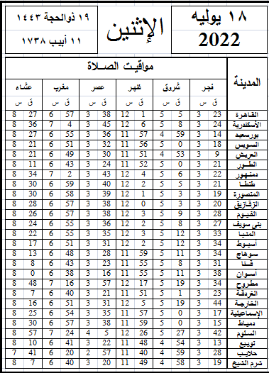 مواقيت الصلاة اليوم وفقًا للتوقيت المحلي لمدينتي القاهرة والإسكندرية وعدد من مدن ومحافظات الجمهورية من واقع بيانات الهيئة العامة للمساحة: