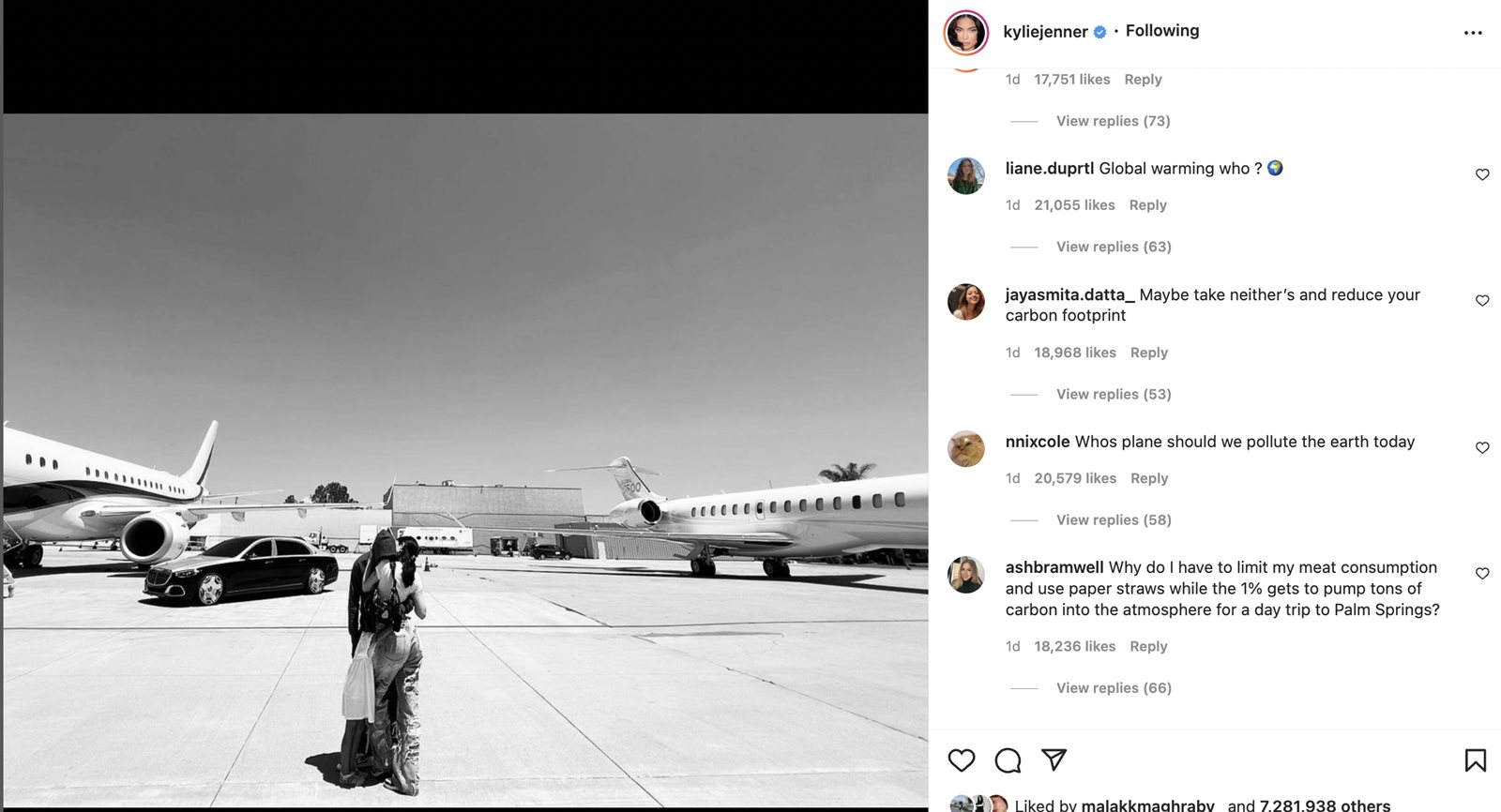 تعرضت نجمة تلفزيون الواقع الأمريكي وسيدة الأعمال المليارديرة كايلي جينر لهجوم حاد في مواقع التواصل الاجتماعي، بعد أن نشرت صورة مع حبيبها ترافيس سكوت بجانب طائراتهم الخاصة متسائلة: "تريد استخدام طائرتي أو طائرتك؟".