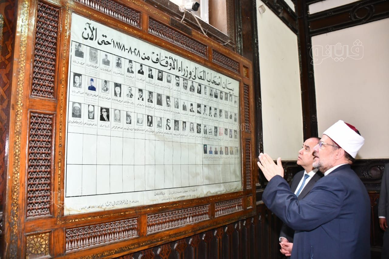 حرص الدكتور محمد مختار جمعة، وزير الأوقاف على التقاط صورة تذكارية مع صور وزراء الأوقاف السابقين أثناء زيارة الطيار محمد منار عنبه، وزير الطيران المدني لديوان عام وزارة الأوقاف.