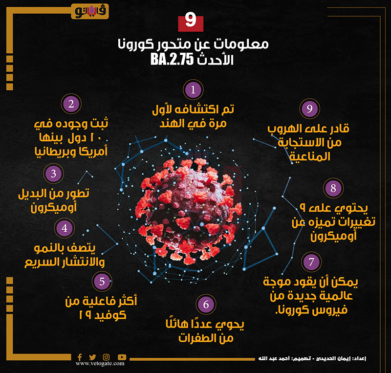 9 معلومات عن متحور كورونا الأحدث BA.2.75 | انفوجراف الأحد 17/يوليو/2022 - 05:41 م 7/17/2022 5:41:52 PM مريض بكوفيد-19 ايمان الحديدي شارك طباعة 18 حجم الخط شارك طباعة كورونا أمريكا بريطانيا ألمانيا الهند