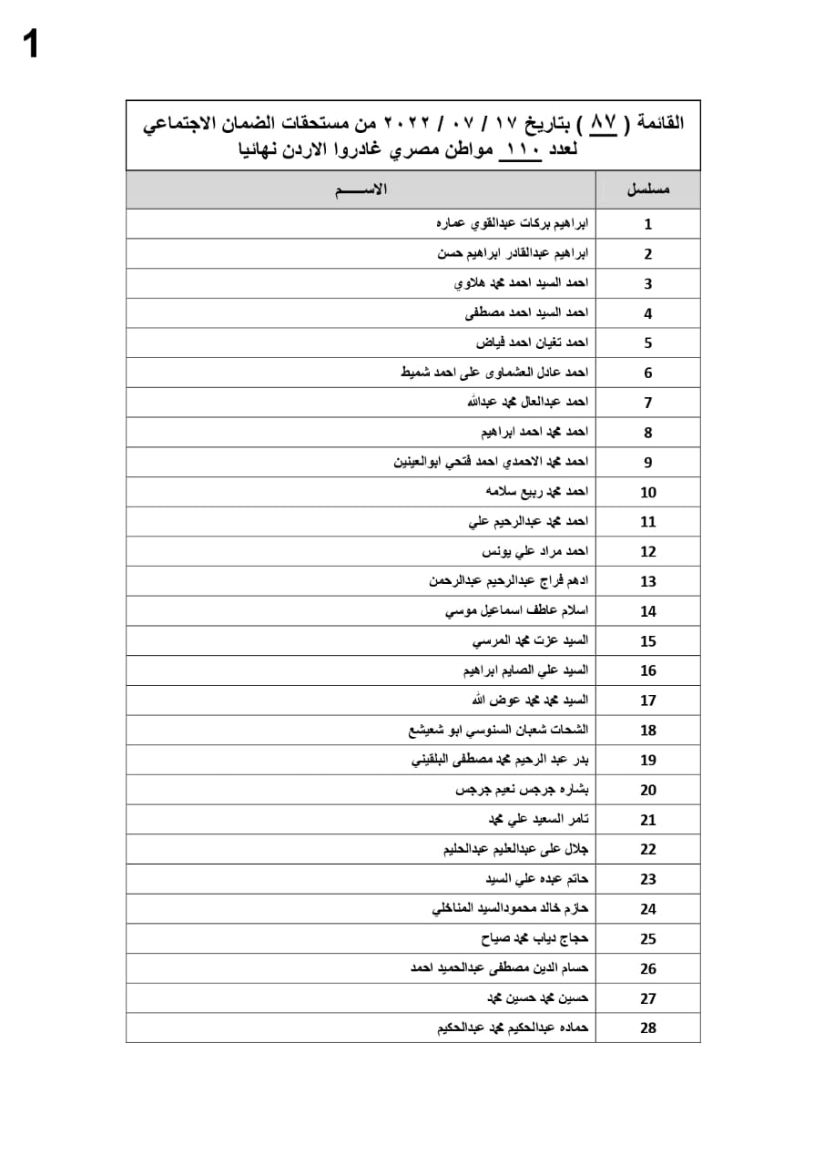 أعلن وزير القوى العاملة، محمد سعفان، أن مكتب التمثيل العمالي التابع للوزارة بالسفارة المصرية بعمان-الأردن، استطاع بالمتابعة اللحظية والجهود المبذولة والمقابلات مع المسئولين بمؤسسة الضمان الاجتماعي بالأردن، واستكمالا لما تم تحويله سابقا، تم تحويل القائمة الـ 87 من مستحقات الضمان الاجتماعي لنحو 110 عمال مصريين لدى المؤسسة غادروا عمان نهائيا.