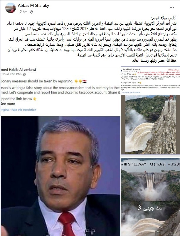 وقال شراقي "يظهر فى الصورة المجاورة سد جيبى 3 من جهتين خلفية لخروج المياه من بوابات السد، وأخرى جانبية، تكشف كذب هذا الموقع الذى يتطاول ويدعى بأننى أنشر أكاذيب عن سد النهضة، ويدعو إلى كتابة تقارير لغلق حسابى، وعمل مشاركة لرابط صفحتى."