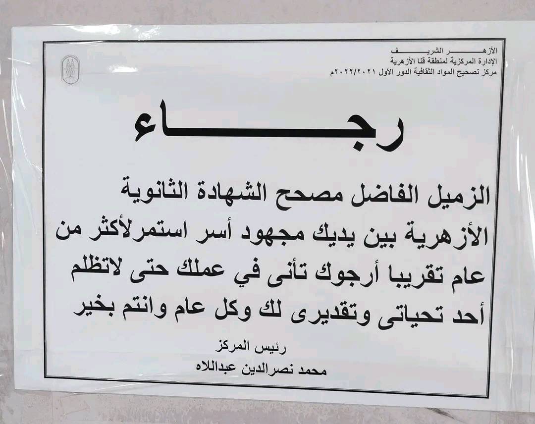 وتداول رواد مواقع التواصل الاجتماعي ومنتدى الأزهر الشريف خلال الساعات الماضية لافتة في أحد مراكز منطقة قناة الأزهرية مكتوب عليها: "الزميل الفاضل مصحح الشهادة الثانوية الأزهرية بين يديك مجهود أسر استمر لأكثر من عام تقريبا أرجوك تأنى في عملك حتى لاتظلم أحد".