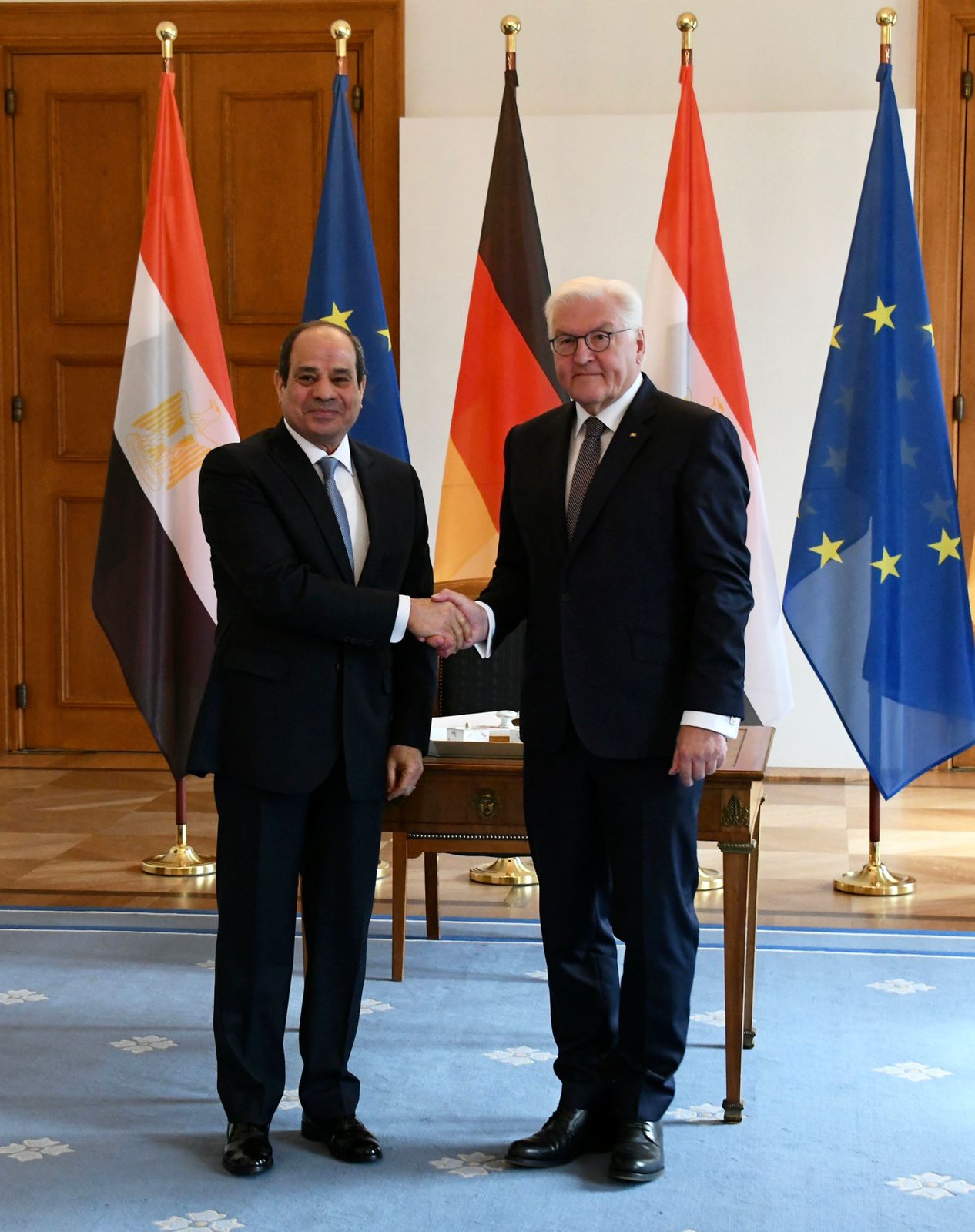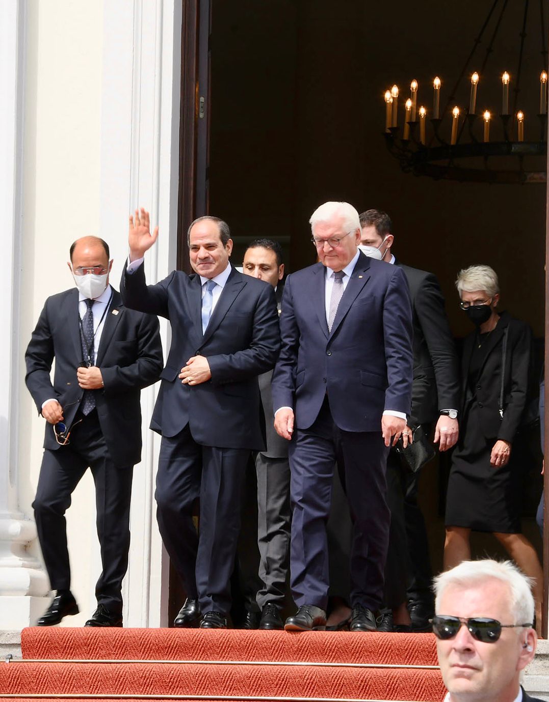 من جانبه؛ رحب الرئيس الألماني الرئيس في برلين، معربًا عن تقدير ألمانيا لمصر على المستويين الرسمى والشعبى، واعتزازها بالروابط التاريخية التى تجمع بين البلدين الصديقين. كما أشاد الرئيس الألماني بالمشروعات القومية التنموية الجارى تنفيذها، مؤكدًا حرص ألمانيا على مساندة جهود مصر التنموية ودعمها فى كافة المجالات من خلال تبادل الخبرات والاستثمار المشترك.