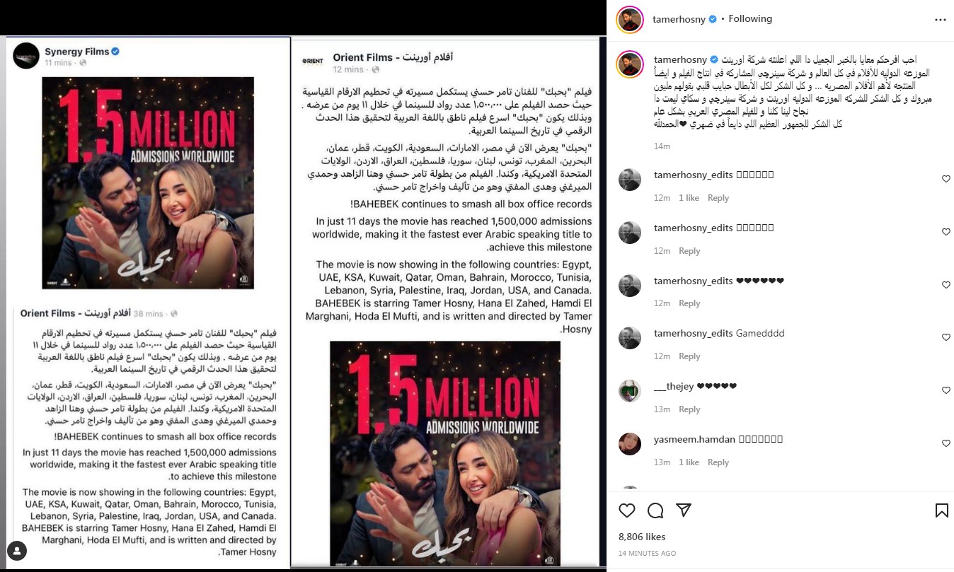 وكتب تامر حسني عبر حسابه على إنستجرام قائلًا: "احب افرحكم معايا بالخبر الجميل دا اللي اعلنته شركة اورينت الموزعه الدوليه للأفلام في كل العالم وشركة سينرچي المشاركه في انتاج الفيلم وايضًا المنتجه لأهم الأفلام المصريه …"