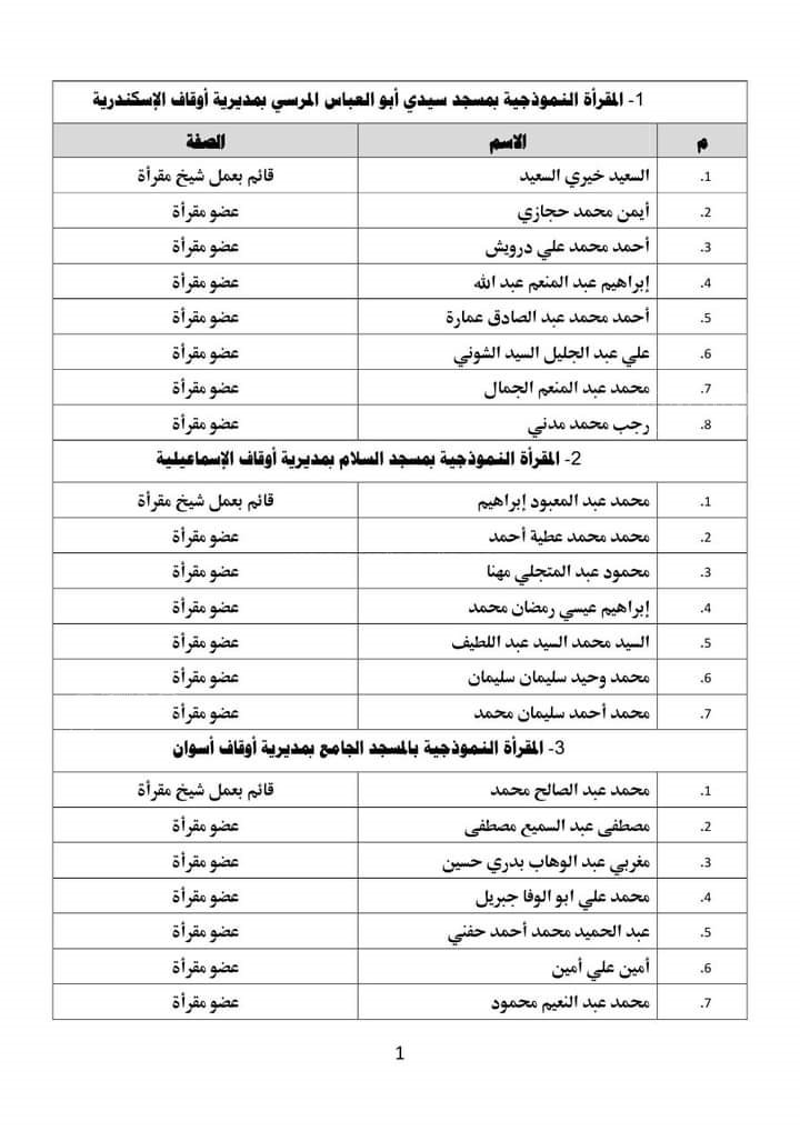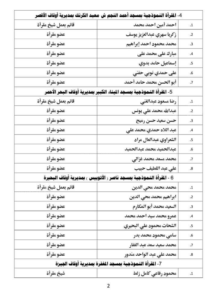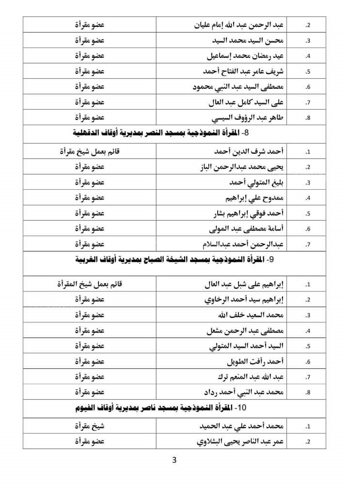 أعلنت وزارة الأوقاف عن اعتماد 16 مقرأة نموذجية جديدة بالمديريات الإقليمية، ليصل عدد المقارئ النموذجية التي تم اعتمادها حتى الآن ( 22 ) مقرأة نموذجية، وتعقد جميعها يوم الأحد من كل أسبوع عقب صلاة الظهر، وهي: