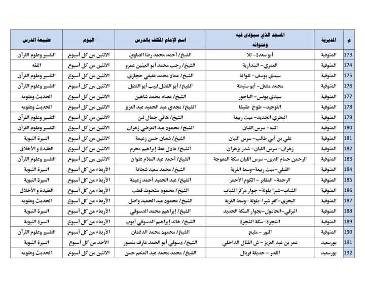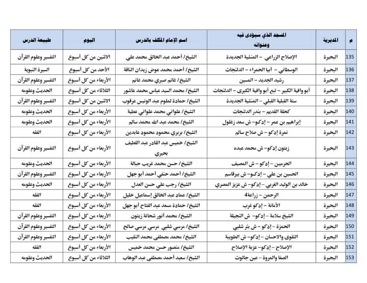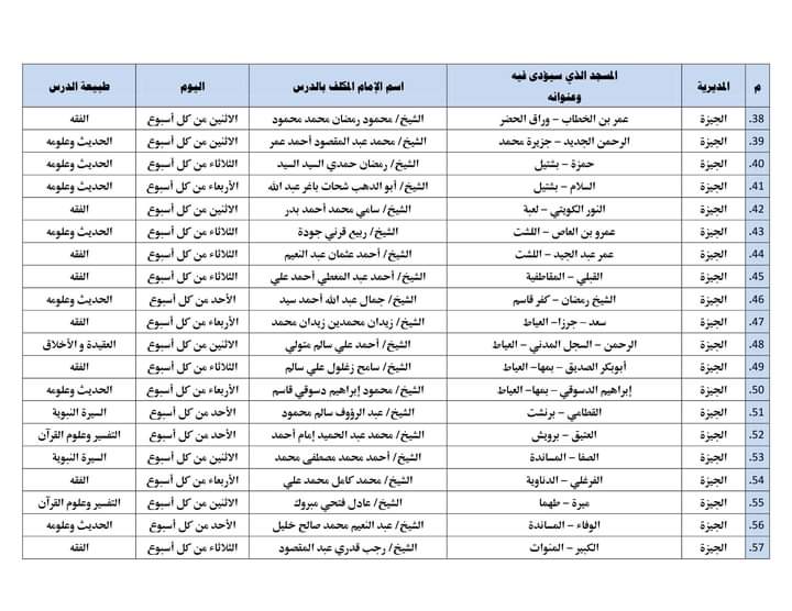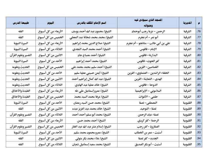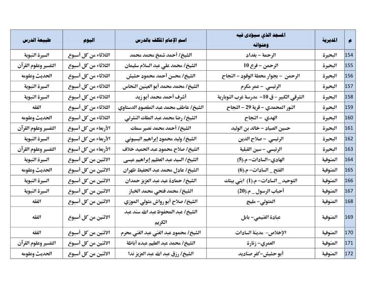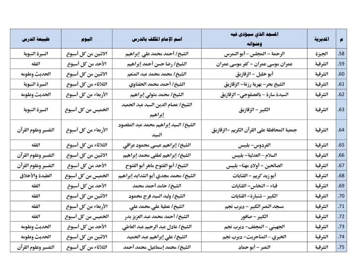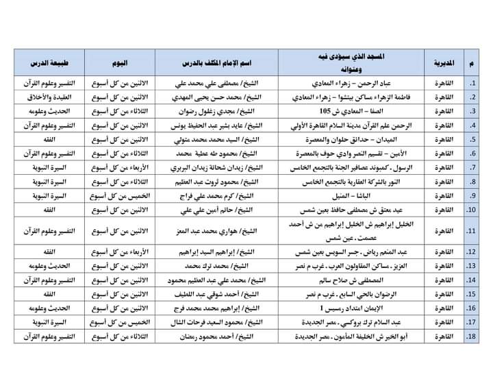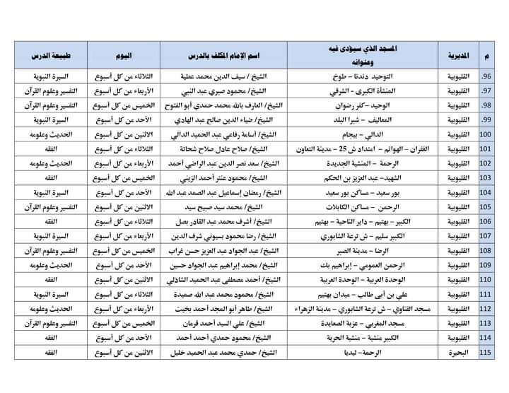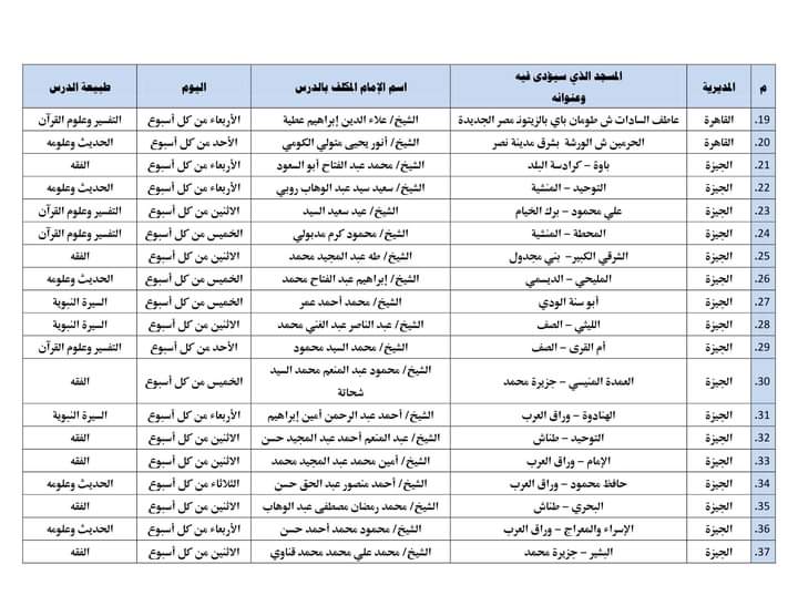 نشرت وزارة الأوقاف بيانًا بمائتي مسجد تطبق الدروس العلمية والدعوية المنهجية، والتي سيبدأ تطبيقها من غد الثلاثاء 19/7/2022م وكل أسبوع بين المغرب والعشاء؛ ليصل عدد المساجد إلى (800) مسجد، وذلك على النحو التالي: