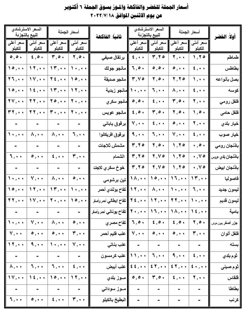 وسجلت أسعار الفلفل الألوان ليتراوح ما بين 4 و6 جنيهات، وسجل كيلو القلقاس من 3 إلى 6 جنيهات، وبلغ سعر الثوم من 7 إلى 11 جنيها، وسعر خس كابوتشي 4.50 جنيه.