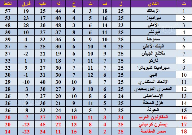 جدول ترتيب الدوري المصري الممتاز بعد الجولة الـ25