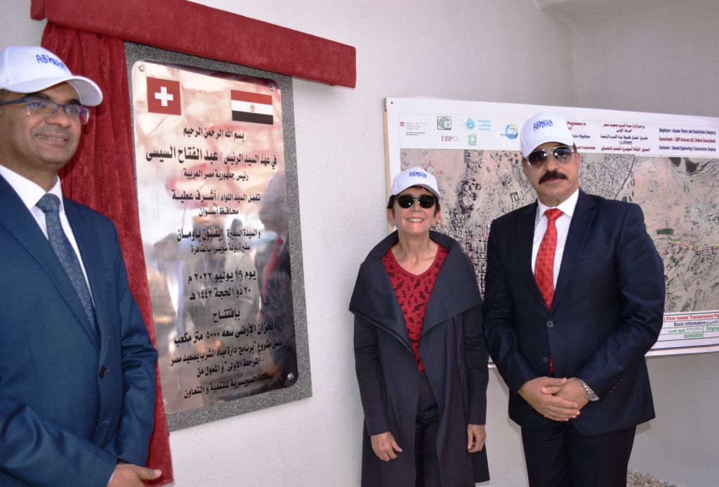 افتتح اللواء أشرف عطية محافظ أسوان، وسفيرة دولة سويسرا بمصر إيفون باومان مشروع تحسين مياه الشرب لخدمة 65 ألف نسمة بمناطق خور عواضة والخطارية والأمبركاب، مع استكمال باقى شبكات ووصلات منطقة الناصرية بتكلفة إجمالية ١٠٠،٥ مليون جنيه والذى يضم محطة رفع المياه بتصريف 800 م3/ ساعة وبتكلفة 17 مليون جنيه.