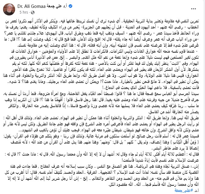وكتب علي جمعة تدوينة على الفيس بوك: "تمرين النفس فيه مقاومة وتعتبر بداية التربية الحقيقية.. أي شيء ترى أن نفسك تريده خالفها فيه.. ويُذكر في الآثار أنهم ذكروا لعمر بن الخطاب- رضي الله عنهم- أحد اليهود في المدينة -قبل أن يُجليهم عن الجزيرة- يُخبر من وراء الكثيف وكأنه لطيف، يعني: يعرف ما وراء الحائط".