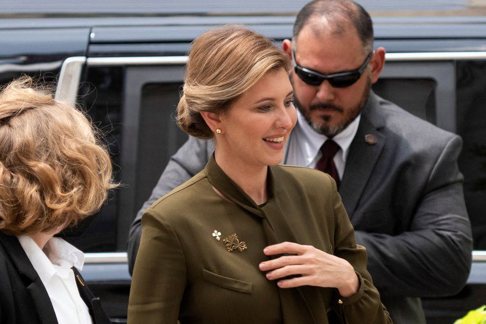 في اليوم الأول لزيارتها إلى واشنطن، التقت زوجة زيلينسكي بوزير الخارجية الأمريكي أنتوني بلينكن. وقد اعتمدت بهذه المناسبة ثوبًا كلاسيكيًّا باللون الأخضر العسكري، وهو اللون نفسه الذي واظب زوجها الرئيس على اعتماده منذ بداية الحرب الروسية على أوكرانيا.