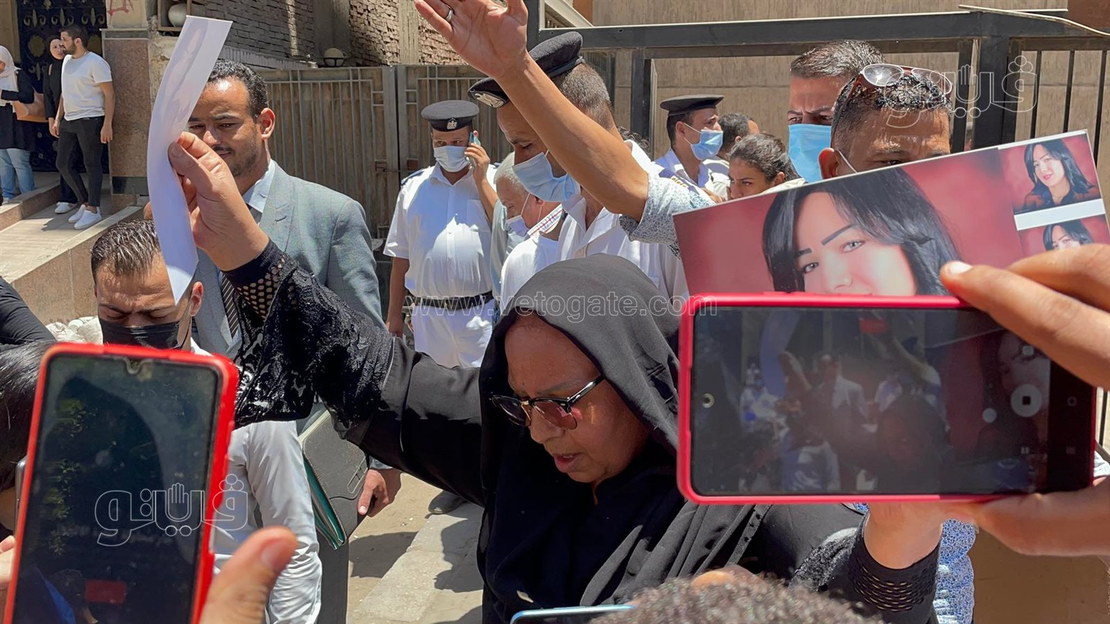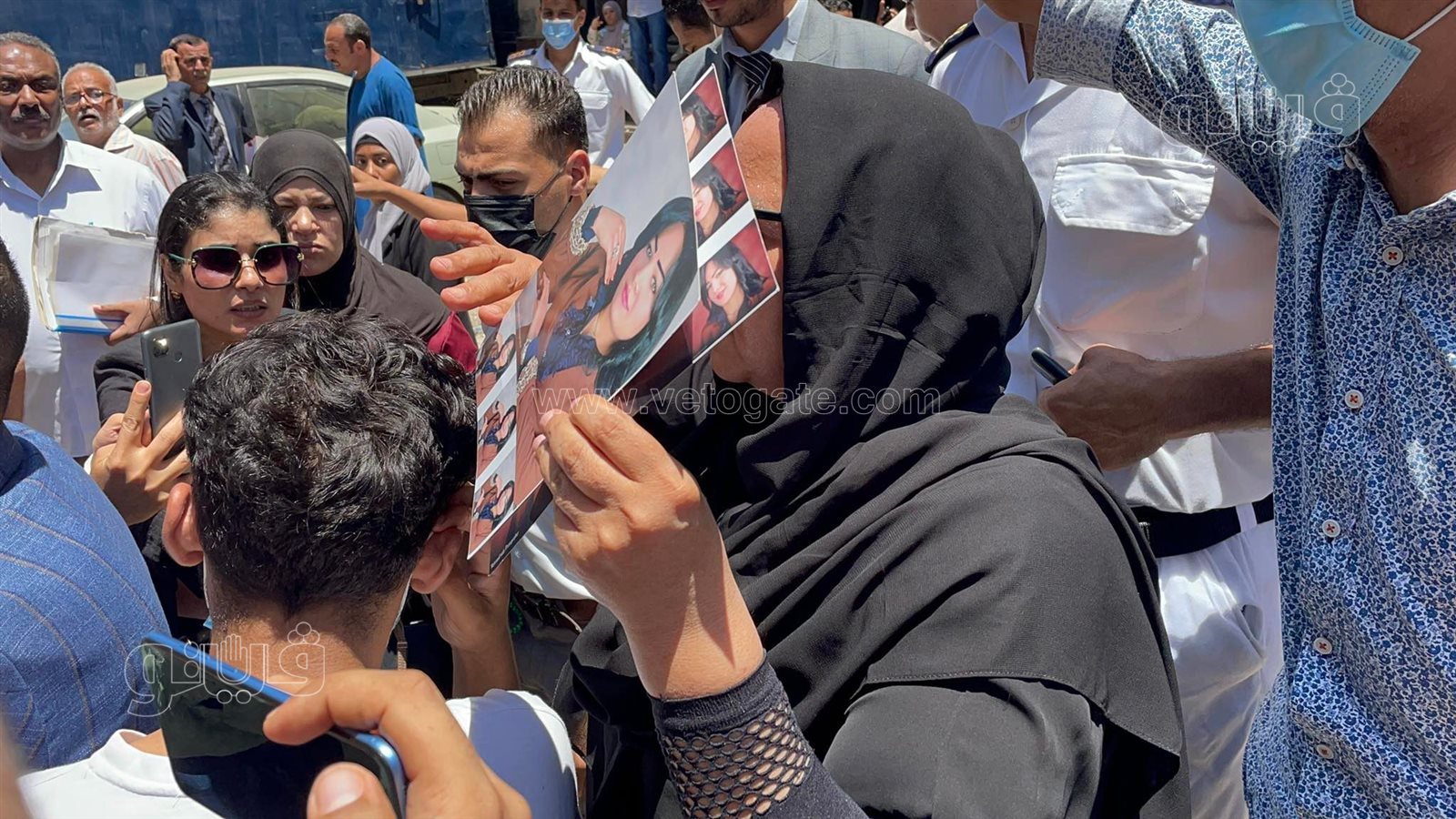 وحملت والدة المذيعة الراحلة بوسترات بصورها أثناء تواجدها في محاكمة المتهمين بقتلها.