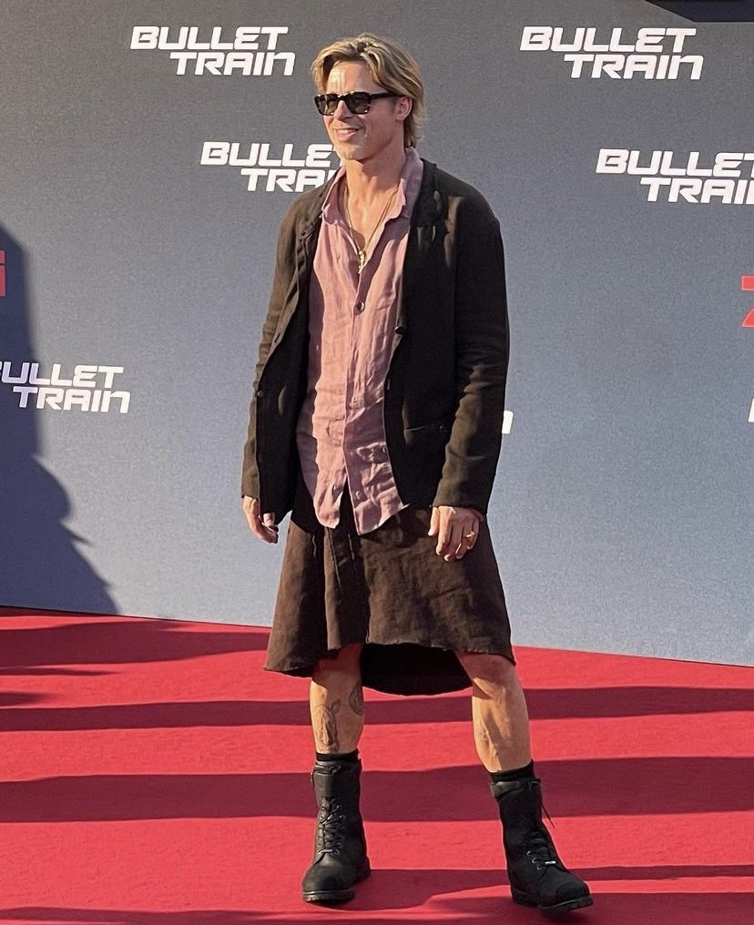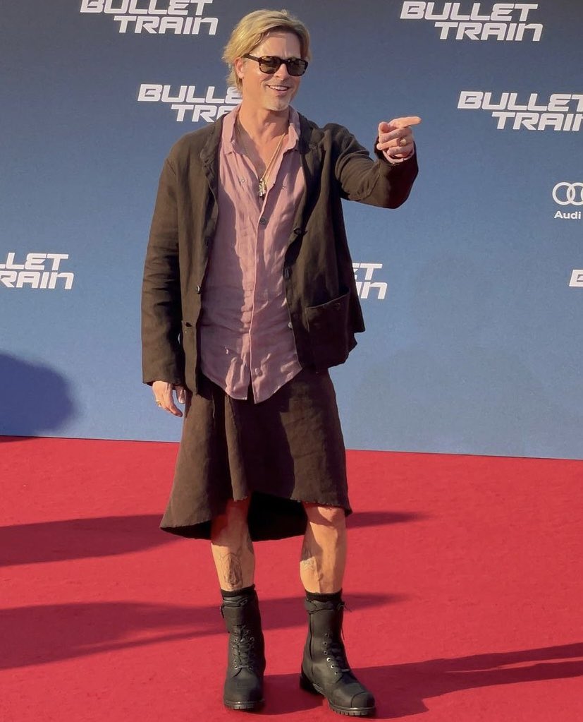 حضر الممثل العالمي براد بيت العرض الأول لفيلمه الجديد Bullet Train في ألمانيا، مرتديا ملابس غريبة، حيث أرتدي “جيبة” قصيرة وحذاء ذو رقبة عالية.