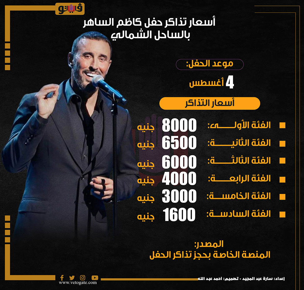 أسعار تذاكر حفل كاظم الساهر بالساحل الشمالي | إنفوجراف الأربعاء 20/يوليو/2022 - 05:18 م 7/20/2022 5:18:04 PM كاظم الساهر سارة عبد المجيد شارك طباعة 18 حجم الخط شارك طباعة حفل كاظم الساهر كاظم الساهر الساحل الشمالى اسعار حفل كاظم الساهر الفن