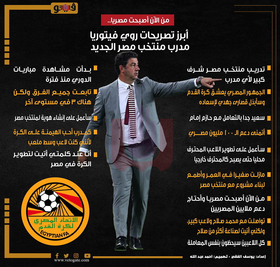 من الآن أصبحت مصريا.. أبرز تصريحات روي فيتوريا مدرب منتخب مصر الجديد | إنفوجراف الأربعاء 20/يوليو/2022 - 07:50 م 7/20/2022 7:50:21 PM روي فيتوريا يوسف الفقي شارك طباعة 18 حجم الخط شارك طباعة روي فيتوريا البرتغالي روي فيتوريا مدرب منتخب مصر الجديد تصريحات روي فيتوريا مؤتمر تقديم روي فيتوريا