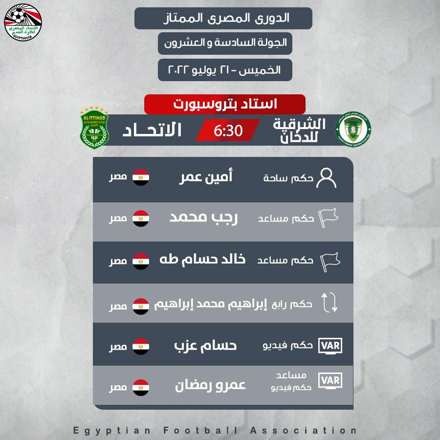 أعلنت لجنة الحكام الرئيسية باتحاد الكرة حكام مباريات الغد بين إيسترن كومباني والاتحاد السكندري باستاد بتروسبورت في افتتاح الجولة السادسة والعشرين للدوري الممتاز.