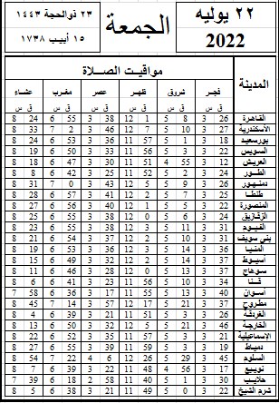 مواقيت الصلاة اليوم وفقًا للتوقيت المحلي لمدينتي القاهرة والإسكندرية وعدد من مدن ومحافظات الجمهورية من واقع بيانات الهيئة العامة للمساحة: