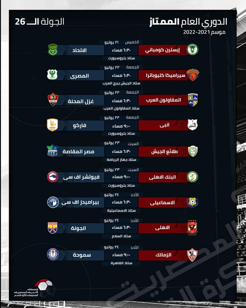 تنطلق اليوم الخميس مباريات الجولة السادسة والعشرين لمسابقة الدوري المصري الممتاز بمواجهة إيسترن كومباني والاتحاد السكندري باستاد بتروسبورت.