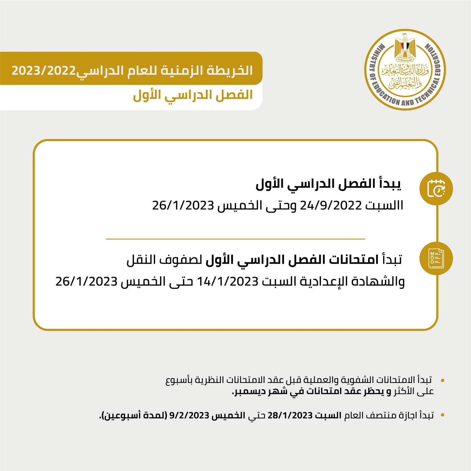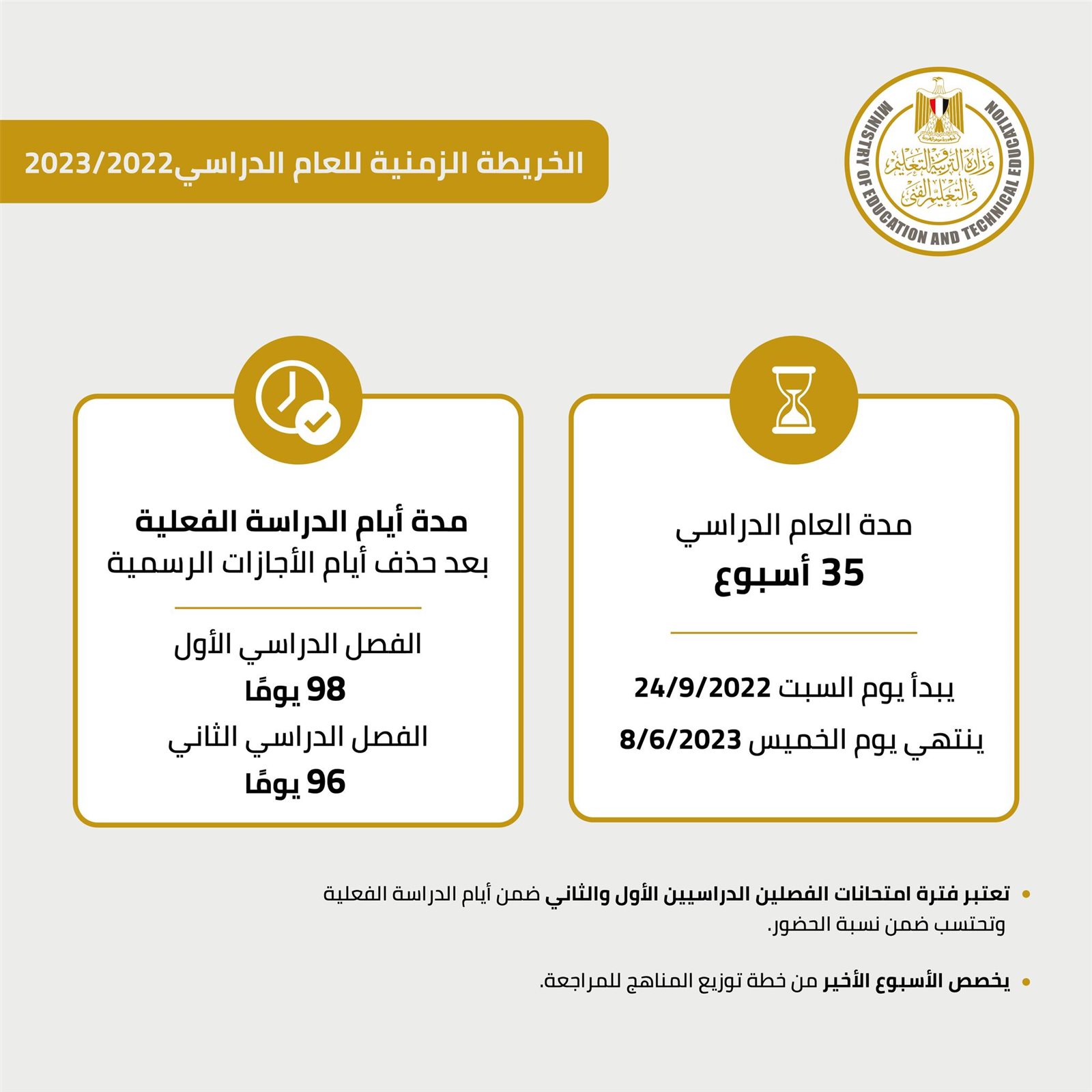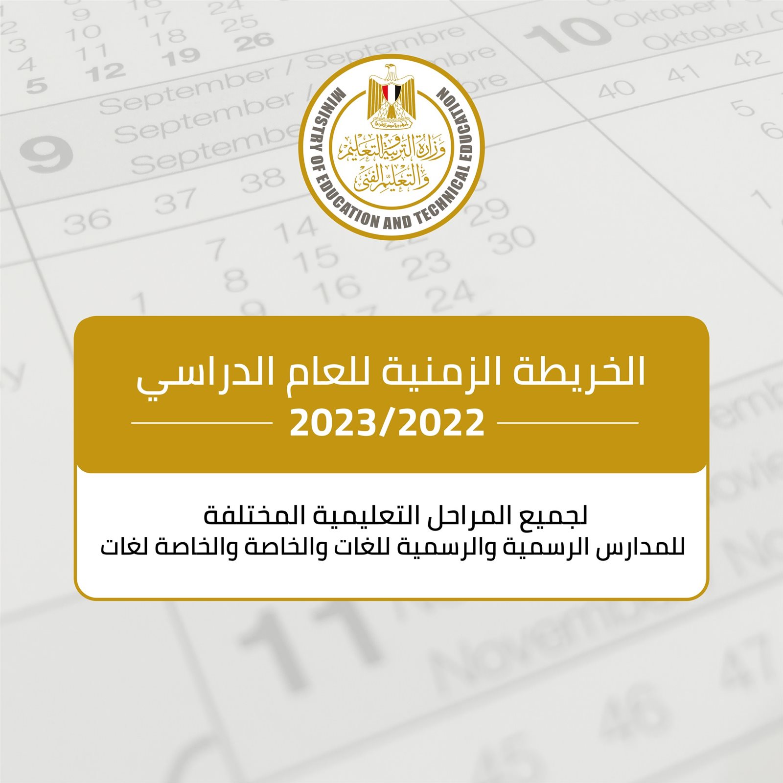 أعلنت وزارة التربية والتعليم والتعليم الفني عن الخريطة الزمنية للعام الدراسي ٢٠٢٢-٢٠٢٣ لجميع مراحل التعليم المختلفة للمدارس الرسمية والرسمية للغات والخاصة والخاصة للغات. يبدأ العام الدراسي يوم السبت٢٤/٩/٢٠٢٢ وينتهي يوم الخميس ٨/٦/٢٠٢٣ ويستمر لمدة ٣٥ أسبوع، وتكون مدة أيام الدراسة الفعلية بعد حذف أيام الإجازات الرسمية ٩٨ يوم للفصل الدراسي الأول و ٩٦ يوما للفصل الدراسي الثاني. تعتبر فترة امتحانات الفصلين الدراسيين الأول والثاني ضمن أيام الدراسة الفعلية وتحتسب ضمن نسبة الحضور.