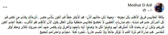وقال مدحت العدل: « بكافة المقاييس فريق الأهلي بكل نجومه - ومهما تكن حالتهم الآن- هم الأوفر حظًا في الفوز بكأس مصر».