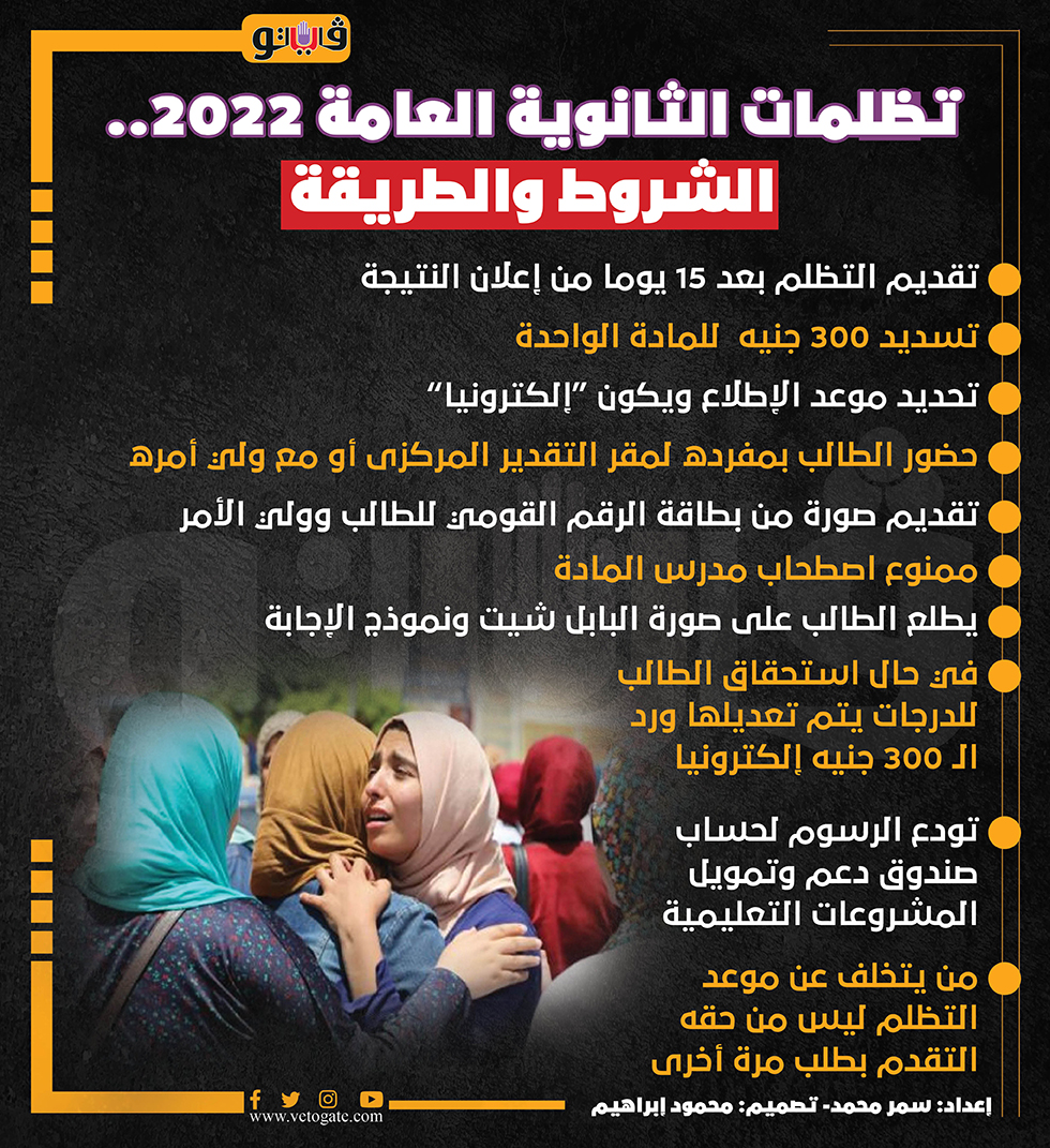 تظلمات الثانوية العامة 2022.. الشروط والطريقة| إنفوجراف الخميس 21/يوليو/2022 - 05:31 م 7/21/2022 5:31:07 PM امتحانات الثانوية العامة 2022 سمر محمد شارك طباعة 18 حجم الخط شارك طباعة الثانوية العامة تظلمات الثانوية العامة صندوق دعم وتمويل المشروعات التعليمية الثانوية العامة 2022