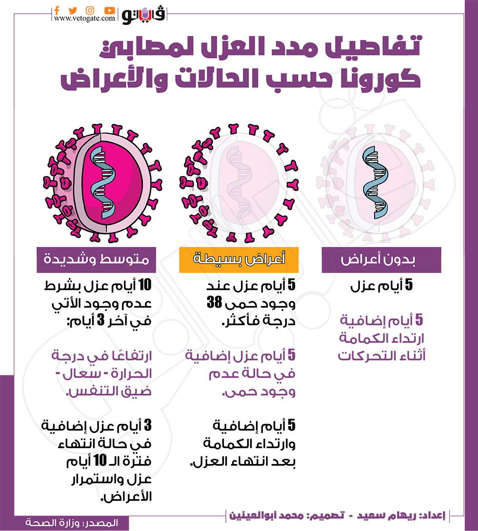 تفاصيل مدد العزل لمصابي كورونا حسب الحالات والأعراض | إنفوجراف الجمعة 22/يوليو/2022 - 03:11 م 7/22/2022 3:11:24 PM فيروس كورونا ريهام سعيد شارك طباعة 18 حجم الخط شارك طباعة مصابي كورونا درجة الحرارة كورونا