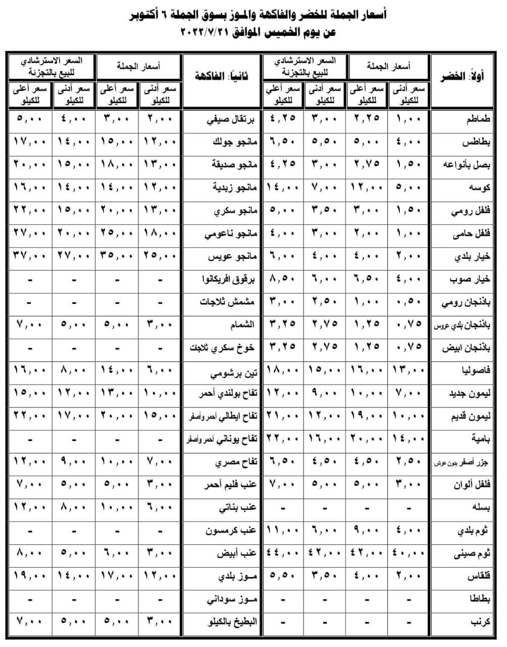 أسعار الخضروات والفواكه بسوق الجملة بالسادس من أكتوبر