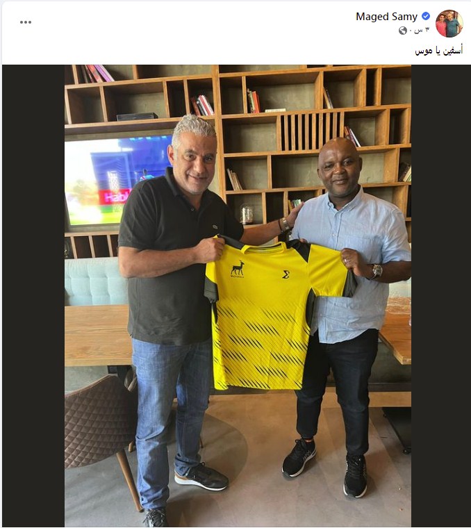 ونشر ماجد سامي عبر حسابه الشخصي بموقع التواصل الاجتماعي "فيس بوك" صورة تجمعه بالجنوب أفريقي بيتسو موسيماني المدير الفني السابق للنادي الأهلي معلقًا: "آسفين يا موس".