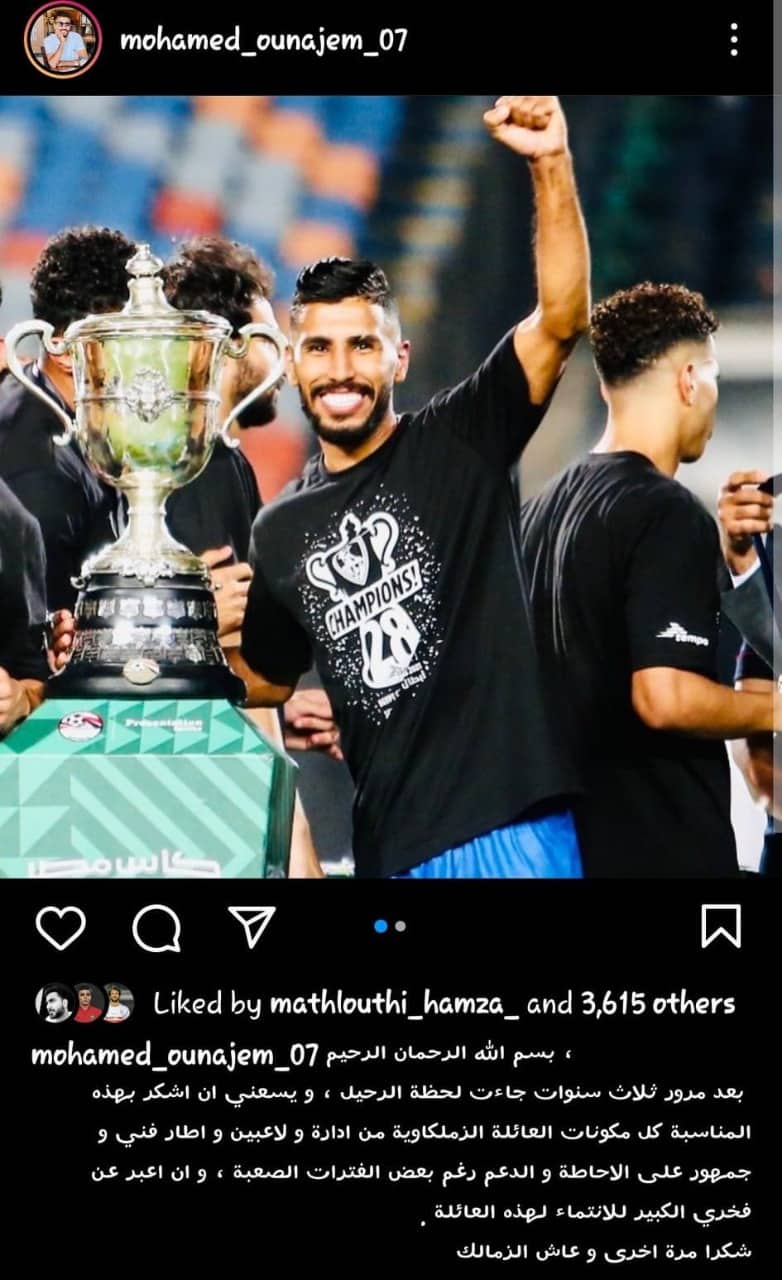 وجَّه اللاعب المغربي محمد أوناجم رسالةً عبر حسابه الرسمي على "إنستجرام" إلى جماهير وإدارة ولاعبي نادي الزمالك، يودِّعهم من خلالها بعد قرار رحيله عن القلعة البيضاء.