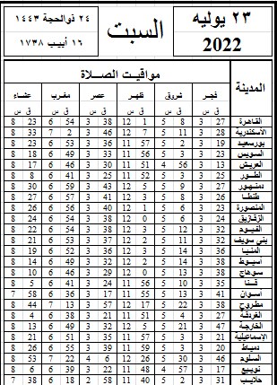 مواقيت الصلاة اليوم وفقًا للتوقيت المحلي لمدينتي القاهرة والإسكندرية وعدد من مدن ومحافظات الجمهورية من واقع بيانات الهيئة العامة للمساحة: