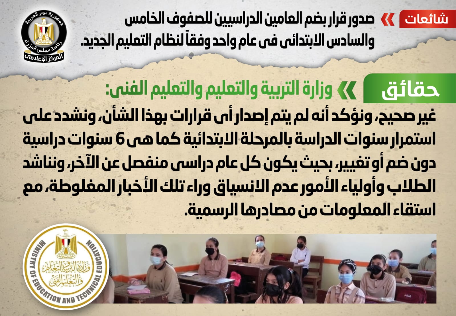 وقد قام المركز الإعلامي لمجلس الوزراء بالتواصل مع وزارة التربية والتعليم والتعليم الفني، والتي نفت تلك الأنباء، مُؤكدةً أنه لا صحة لضم العامين الدراسيين للصفوف الخامس والسادس الابتدائي في عام واحد وفقاً لنظام التعليم الجديد، وأنه لم يتم إصدار أي قرارات بهذا الشأن.
