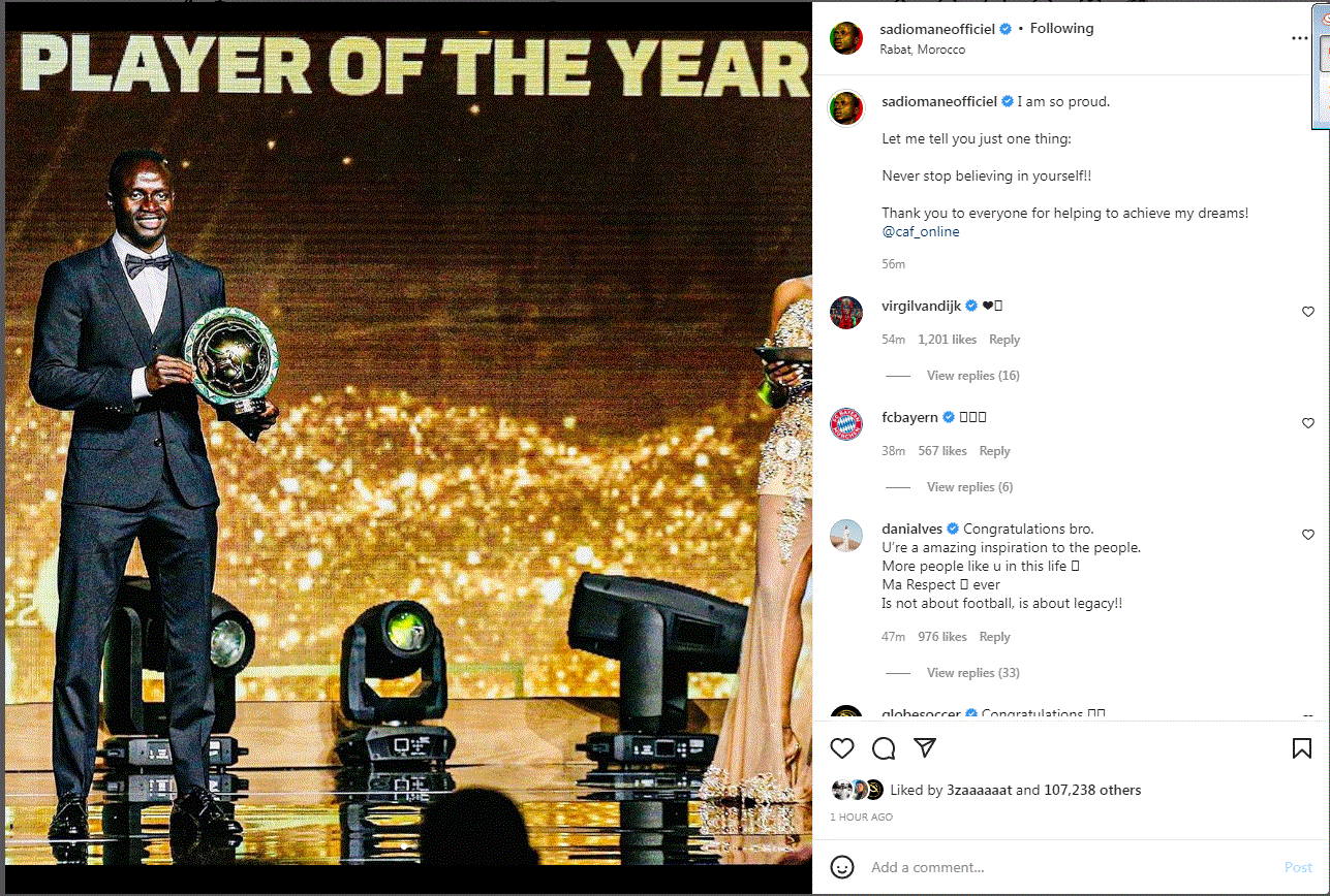 ونشر ماني عبر صفحته الرسمية على موقع التواصل الإجتماعي “ انستجرام ” صورة أثناء تكريمه بجائزة أفضل لاعب في أفريقيا وكتب عليها: أنا فخور جدا