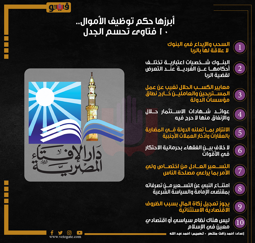 أبرزها حكم توظيف الأموال.. 10 فتاوى تحسم الجدل | إنفوجراف السبت 23/يوليو/2022 - 07:30 م 7/23/2022 7:30:31 PM حكم توظيف الأموال أحمد رأفت منتصر شارك طباعة 18 حجم الخط شارك طباعة مفتى الجمهورية توظيف الأموال شهادات الاستثمار هل فوائد البنوك حرام حكم توظيف الأموال خارج البنوك التسعيرة الجبرية هل فوائد البنوك حلال حكم فوائد شهادات الإستثمار