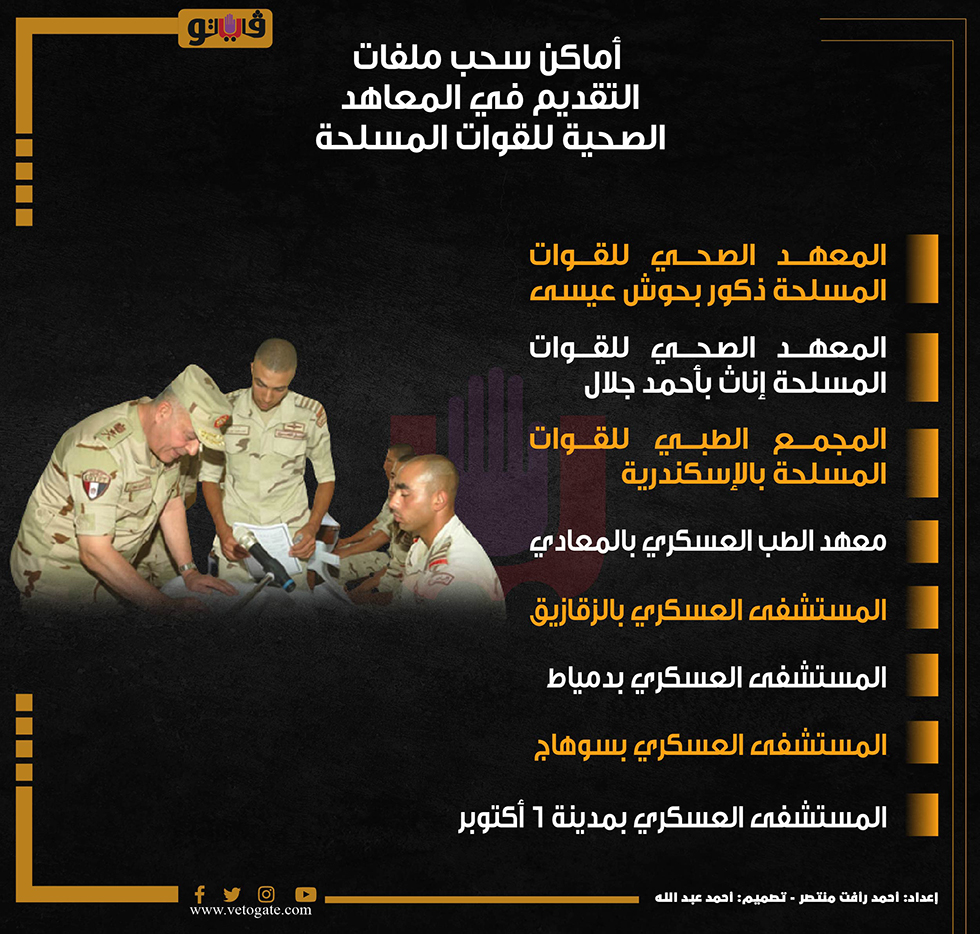 أماكن سحب ملفات التقديم في المعاهد الصحية للقوات المسلحة |إنفوجراف الإثنين 25/يوليو/2022 - 03:34 م 7/25/2022 3:34:44 PM أحمد رأفت منتصر شارك طباعة 18 حجم الخط شارك طباعة المجمع الطبى للقوات المسلحة المعهد الصحى للقوات المسلحة المستشفى العسكرى الطب العسكري أماكن سحب ملفات المعاهد الصحية للقوات المسلحة