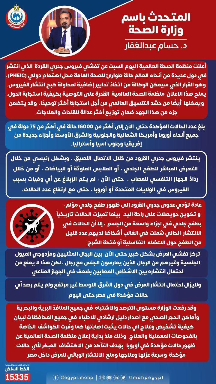 كشف الدكتور حسام عبدالغفار المتحدث باسم وزارة الصحة عن أهمية إعلان منظمة الصحة العالمية اليوم السبت عن تفشي فيروس جدري القردة الذي انتشر في دول عديدة من أنحاء العالم حالة طوارئ للصحة العامة محل اهتمام دولي (PHEIC).
