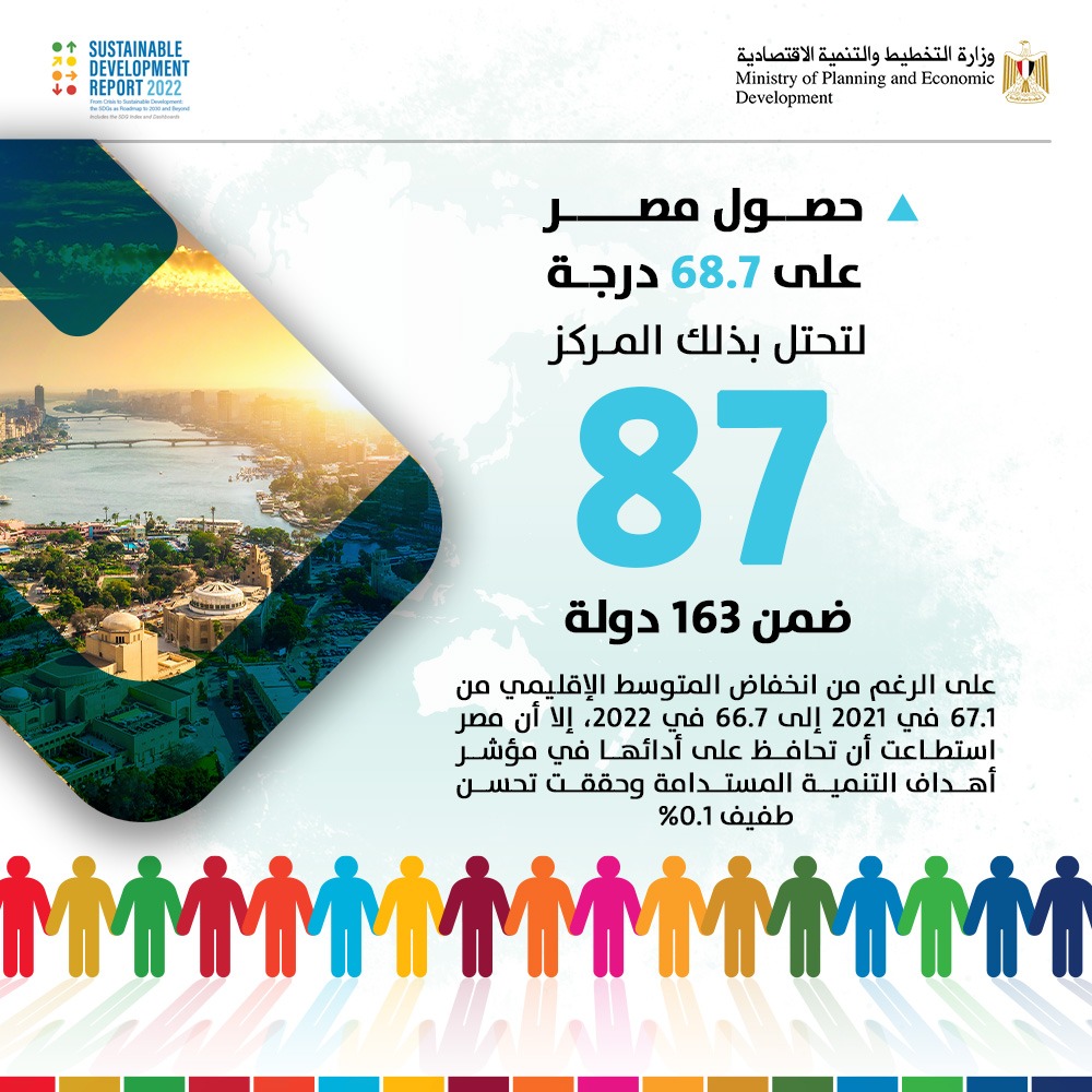 وحول تطور أداء مصر في مؤشر أهداف التنمية المستدامة؛ أشارت الدكتورة هالة السعيد، وزيرة التخطيط والتنمية الاقتصادية إلى حصول مصر على 68.7 درجة عام 2022، وهى بذلك استطاعت أن تحافظ على أدائها في المؤشر؛ بالرغم من انخفاض المتوسط الإقليمي من 67.1 في 2021 إلى 66.7 في 2022، لتحتل بذلك المركز 87 ضمن 163 دولة يشملهم التقرير.