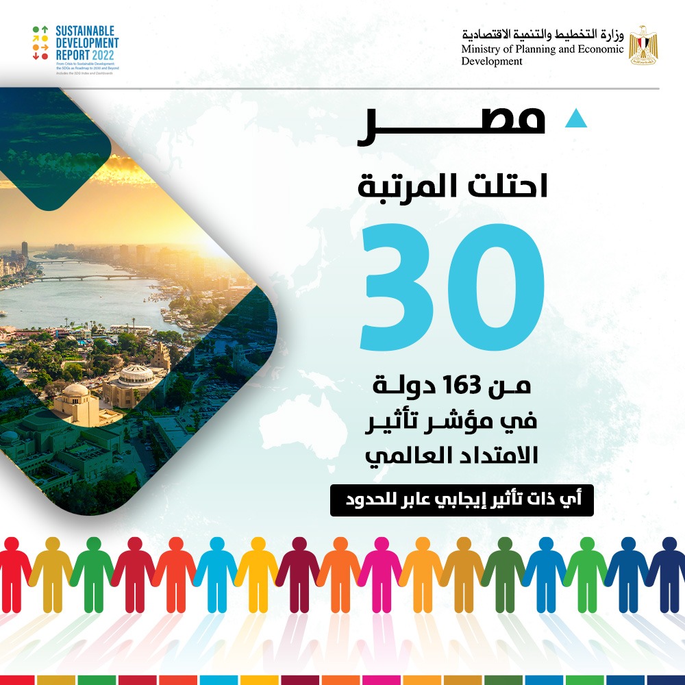 وحول أداء مصر في مؤشر تأثير الامتداد العالمي، أشار التقرير إلى أن هذا المؤشر يقيس الآثار الإيجابية والسلبية العابرة للحدود من دولة لأخرى، والتي تؤثر على قدرة الدول في تحقيق أهداف التنمية المستدامة على مستوى ثلاثة أبعاد هي التداعيات البيئية والاجتماعية المتجسدة في التجارة، التداعيات الاقتصادية والمالية، بالإضافة إلى التداعيات الأمنية. وأوضح التقرير أن مصر احتلت المرتبة 30 من 163 دولة مقابل 36 من 165 دولة في 2021؛ مما يعكس التحسن في درجتها في المؤشر التي وصلت إلى 98.82 من 100 درجة، وبالتالي ترتفع التداعيات الإيجابية لمصر مقارنة بالسلبية.