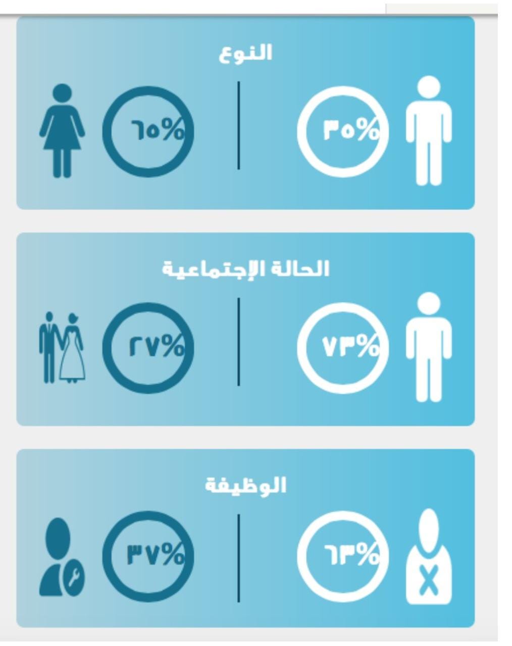 وأشارت النتائج الى أن نسبة المستخدمين من الإناث وصلت إلى ٦٥٪ مقابل ٣٥٪ من المستخدمين الذكور، وأن نسبة الحالة الاجتماعية للمستخدمين ٢٧٪ للمتزوجين مقابل ٧٣٪ لغير المتزوجين، بالإضافة إلى أن أكثر المستخدمين من غير العاملين وصل إلى ٦٣٪ مقابل ٣٧٪ للعاملين حتى الآن.