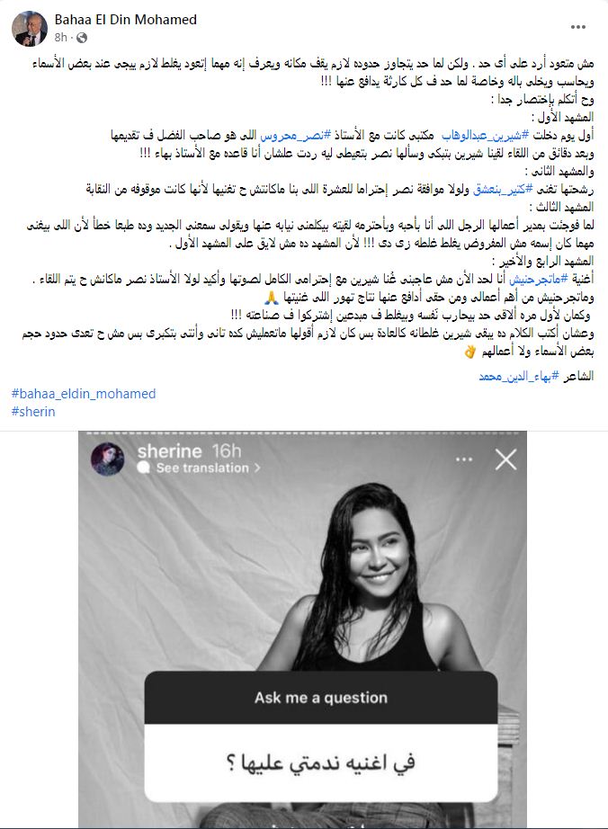 واختتم قائلا: "وكمان لأول مرة ألاقي حد بيحارب نَفسه وبيغلط في مبدعين اشتركوا في صناعته.. وعشان أكتب الكلام ده يبقى شيرين غلطانه كالعادة، بس كان لازم أقولها ما تعمليش كده تاني وأنتي بتكبري بس مش هتعدي حدود حجم بعض الأسماء ولا أعمالهم"