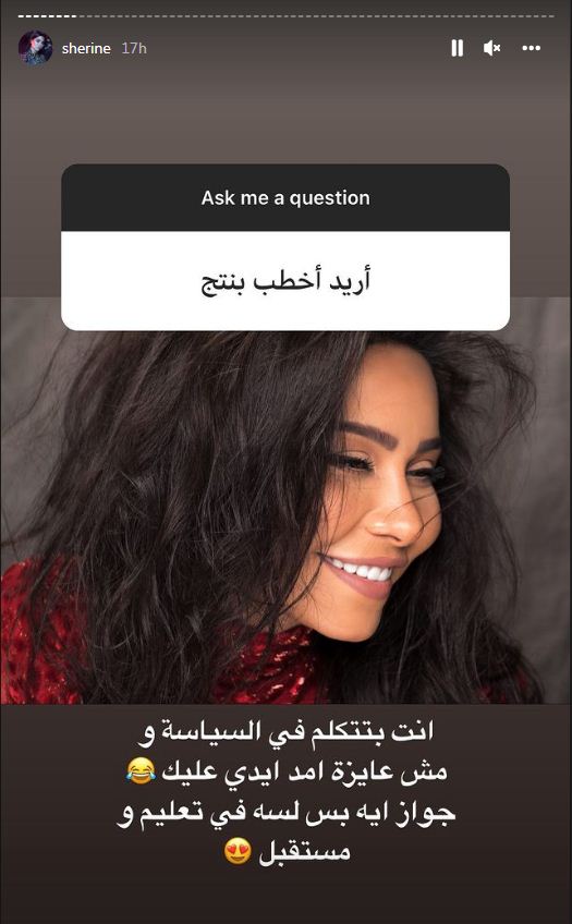 وعبر خاصية الاستوري فتحت شيرين عبد الوهاب باب الأسئلة لمتابعيها، ليقول لها متابع: "أريد أخطب بنتك"، وردت شيرين عليه قائلة: "إنت بتتكلم في السياسة ومش عايزة أمد ايدي عليك، جواز إيه بس لسه فيه تعليم ومستقبل".
