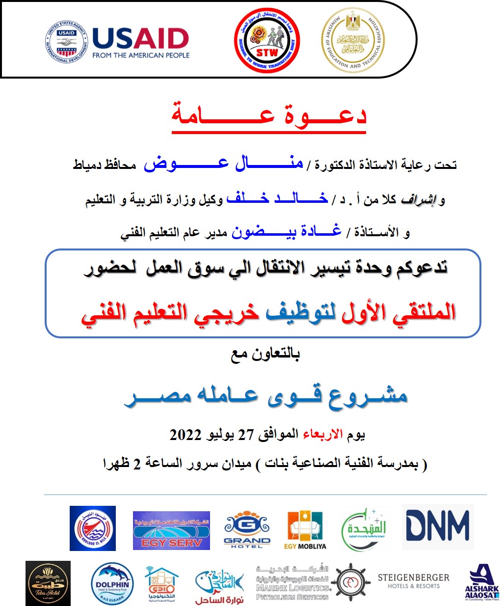 وتقرر إقامة الملتقى التوظيفي الأول تحت رعاية الدكتورة منال عوض محافظ دمياط وتحت إشراف الدكتور خالد خلف قبيصي والقيام بالإجراءات التنفيذية عن طريق غادة بيضون مدير عام التعليم الفني والوحدة الفرعية لتيسير الانتقال لسوق العمل ويحضر الملتقى ممثلو 15 شركة من شركات ومصانع القطاع الخاص .