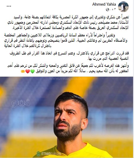 أعلن أحمد يحيي حارس مرمي الاتحاد السكندري تراجعه عن قرار الاعتزال رسميا، وذلك من خلال منشور عبر صفحته علي موقع التواصل الاجتماعي فيس بوك.