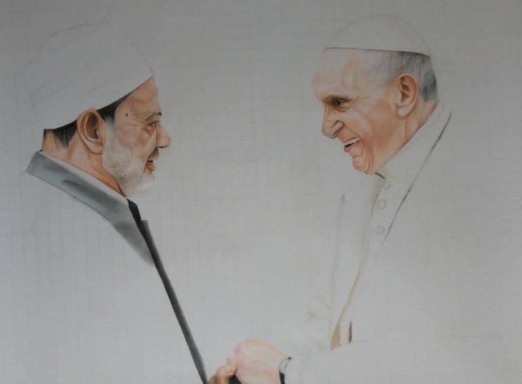 وقالت الفنانة الشابة خلود أحمد إسماعيل، الطالبة بالصف الثالث الثانوي الأزهري بمعهد فتيات سموحة النموذجي: أحببت الرسم منذ الطفولة وشببت على ذلك، وأحب الإمام الأكبر وأشعر كأنه أبي، وهو بمثابة الأب للجميع، مضيفة أنها شاركت في معارض عدة بلوحات مختلفة، منها لوحة شيخ الأزهر وبابا الفاتيكان بمناسبة يوم الإنسانية، واستخدمت في تلوين اللوحة الألوان الخشبية، فضلا على وضع بعض اللمسات ومنها حمامتي السلام تعبيرا عن الحالة التي أرساها الرمزان بين الشعوب.
