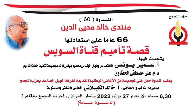 ينظم حزب التجمع برئاسة النائب سيد عبد العال عضو مجلس الشيوخ ورئيس حزب التجمع منتدى خالد محيى الدين الستين باحتفالية تحت “عنوان قصة تاميم قناة السويس ”66عاما على استعادتها يوم الأربعاء القادم الموافق 27 يوليو فى السادسة والنصف بالمقر المركزى للحزب بشارع طلعت حرب.
